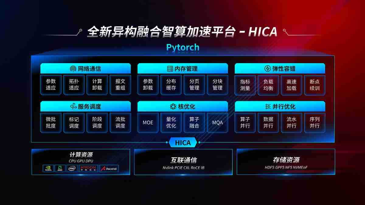 通过自研的服务层、、、中间适配层、、以及调度编排算法,,采用数据并行、、、、模型并行等多种并行方式,,,把并行计算任务进行有效的分解,,,,使其分别由相应的软件栈和算力资源来承接。。。当GPU资源变化,,HICA可以实时动态调度计算子任务并调整模型拓扑和架构,,,以充分聚合各种算力资源。。