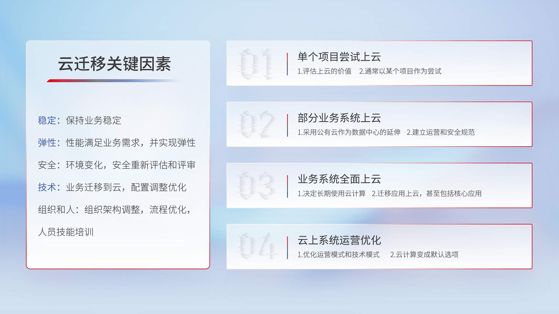 结合实际业务,,从规划设计、、云平台选型、、、云原生改造、、、、数据迁移、、集成交付,,,,迁移全过程为客户识别最佳上云路径,,,,做好风险识别管理,,设计网络架构、、、身份权限、、安全审计合规、、、、操作审计、、、日志审计、、、监控告警策略、、、多站点容灾设计等,,对云上基础设施进行整体规划,,,,提升IT治理水平,,以满足弹性、、、、高可用、、高性能的需求。。。。