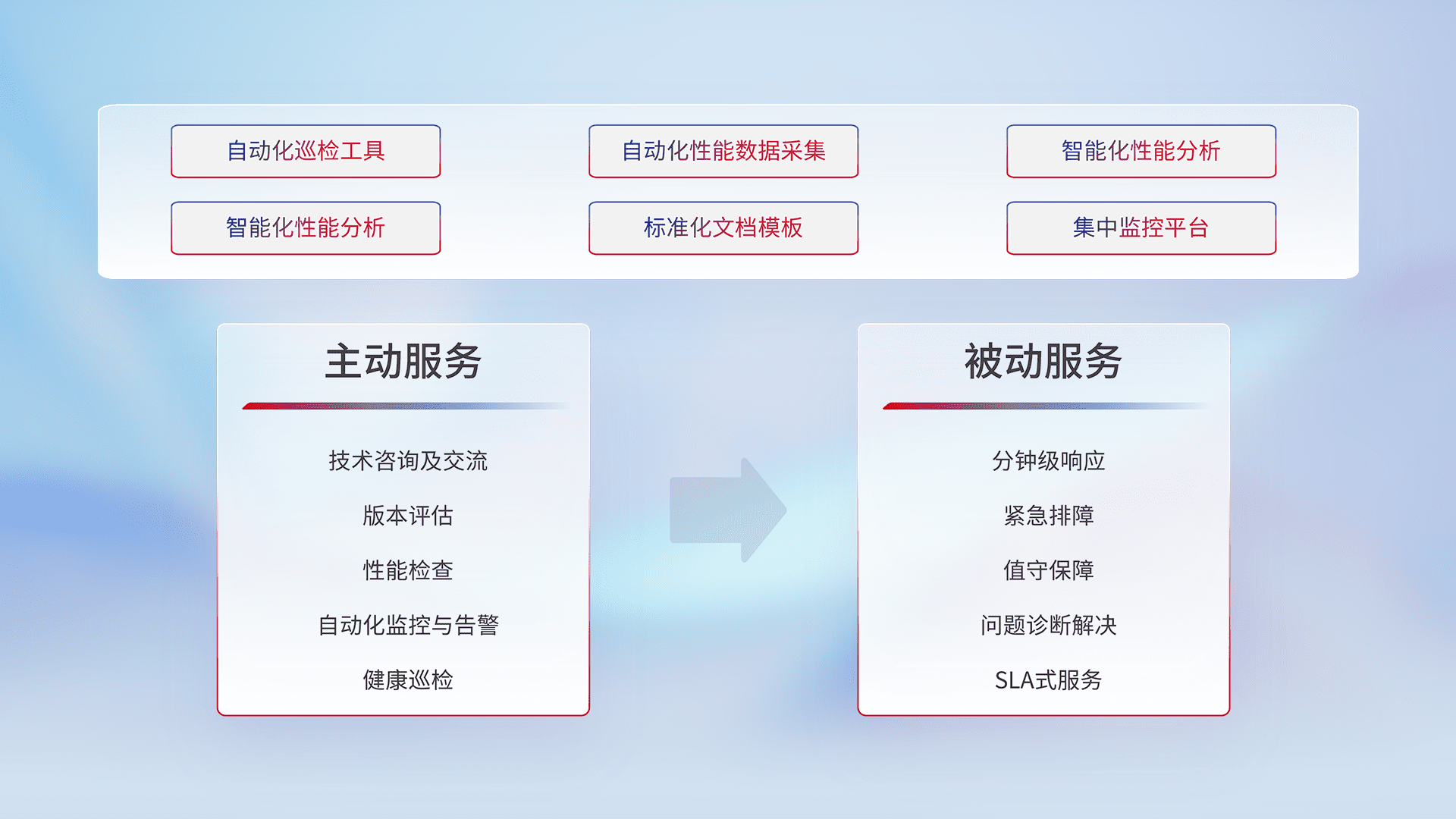 智能化工具和标准化文档,,保障服务质量,,,,提供主动服务(包含技术咨询、、版本评估、、性能检查、、自动化监控与告警、、、、健康巡检)和被动服务包含(分钟级响应、、、、紧急排障、、、、值守保障、、问题诊断解决、、、、SLA服务)。。。。